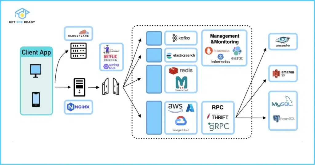 - Messaging and Queues: Kafka for pub-sub, RabbitMQ for tasks.