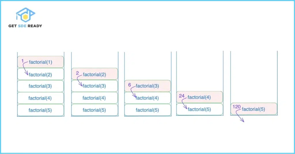 - Recursive Case: Here, the function calls itself with a modified input that moves closer to the base case. Like in factorial(n) = n * factorial(n-1).