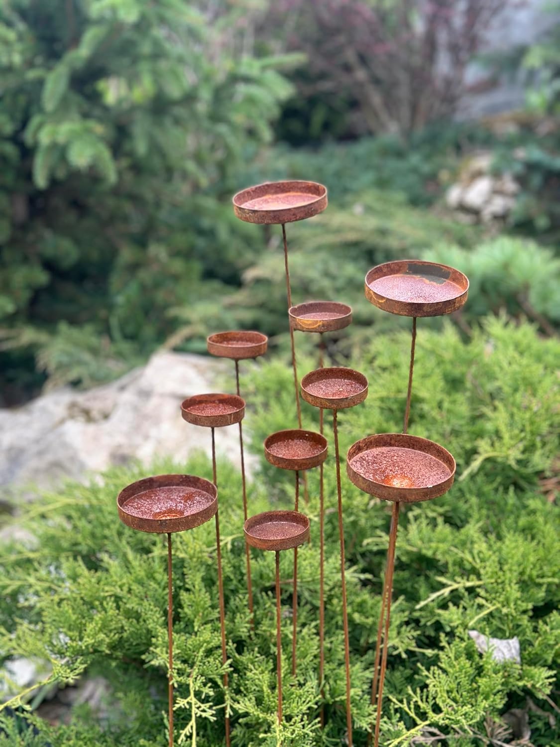 This Rustic metal flowers set of 10 will place decorative accent in the garden compositions and landscape, create an atmosphere of romance and coziness in your home. This rusty metal art could be used as decoration at your home, in your garden, backyard, terrace or entrance to your home. This yard decor made from natural metal and it covered with a natural rust. This rusty garden decor can be used all year round, it is not afraid of precipitation, direct sunlight, etc. Elevate outdoor spaces with our exquisite garden decor, an ideal gift for passionate garden lovers. Whether it's a birthday, anniversary, housewarming or any special occasion, this unique and beautifully crafted addition will bring joy to their green haven.